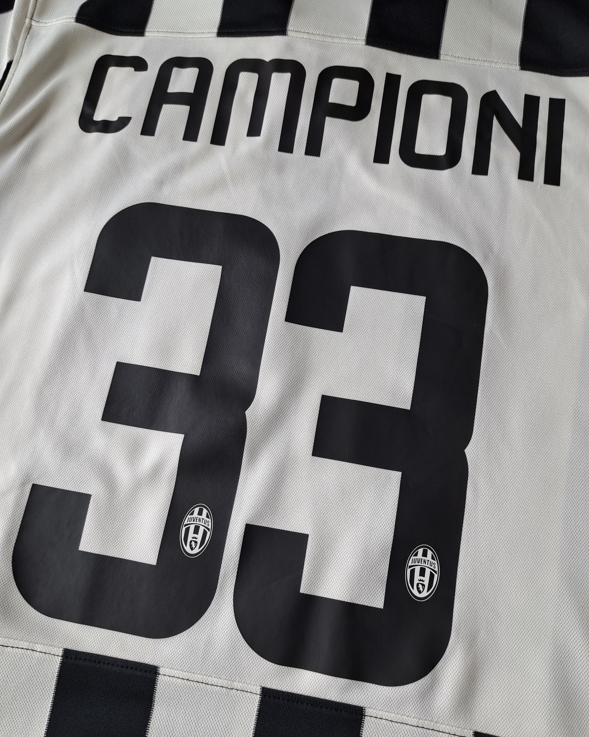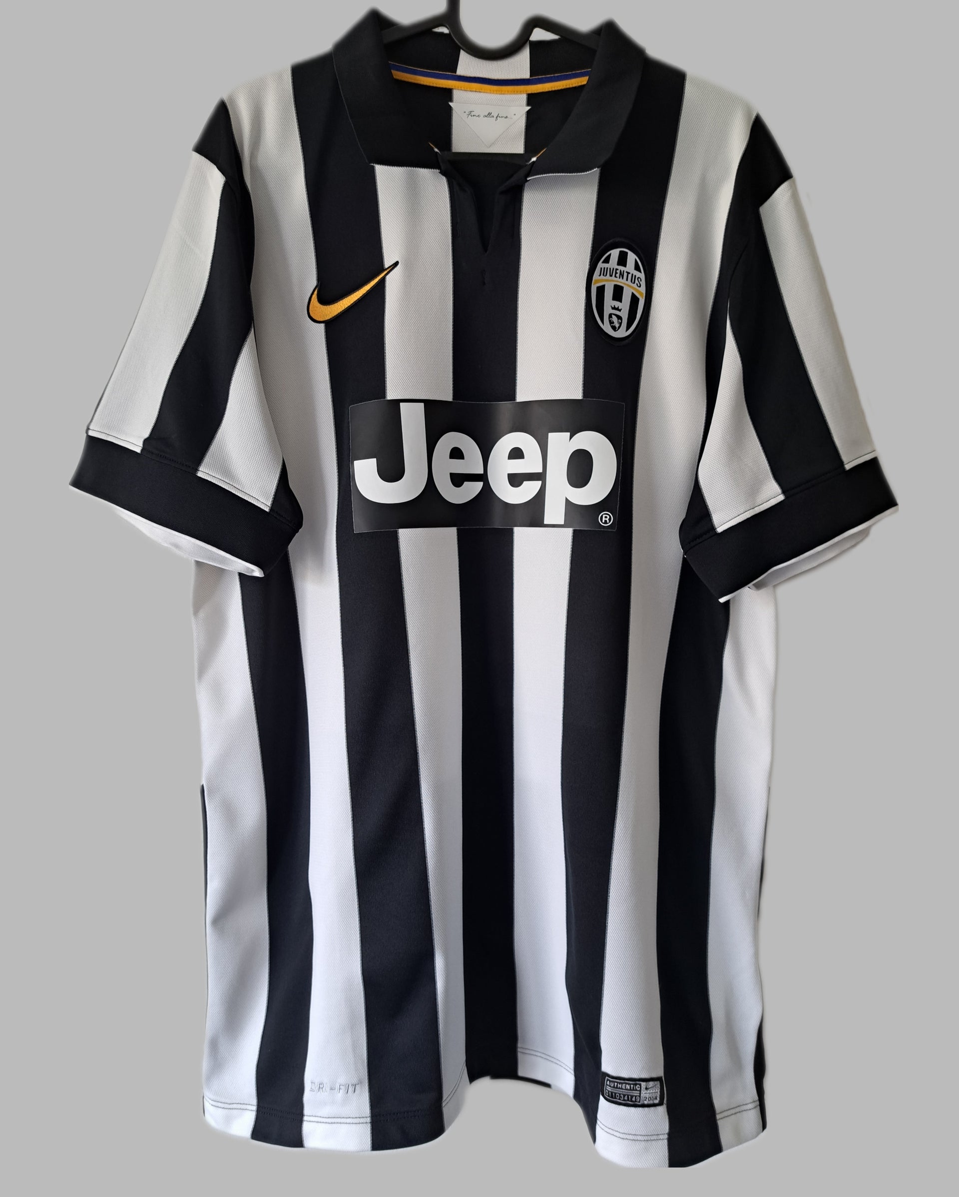 A typical Juventus kit. The shirt has black and white stripes with nice collar. The shirt was worn in the 2014-15 season were Juve won the Serie A and Coppa Italia and got to the Champions League final. Worn by the likes of Pogba, Pirlo and Tevez