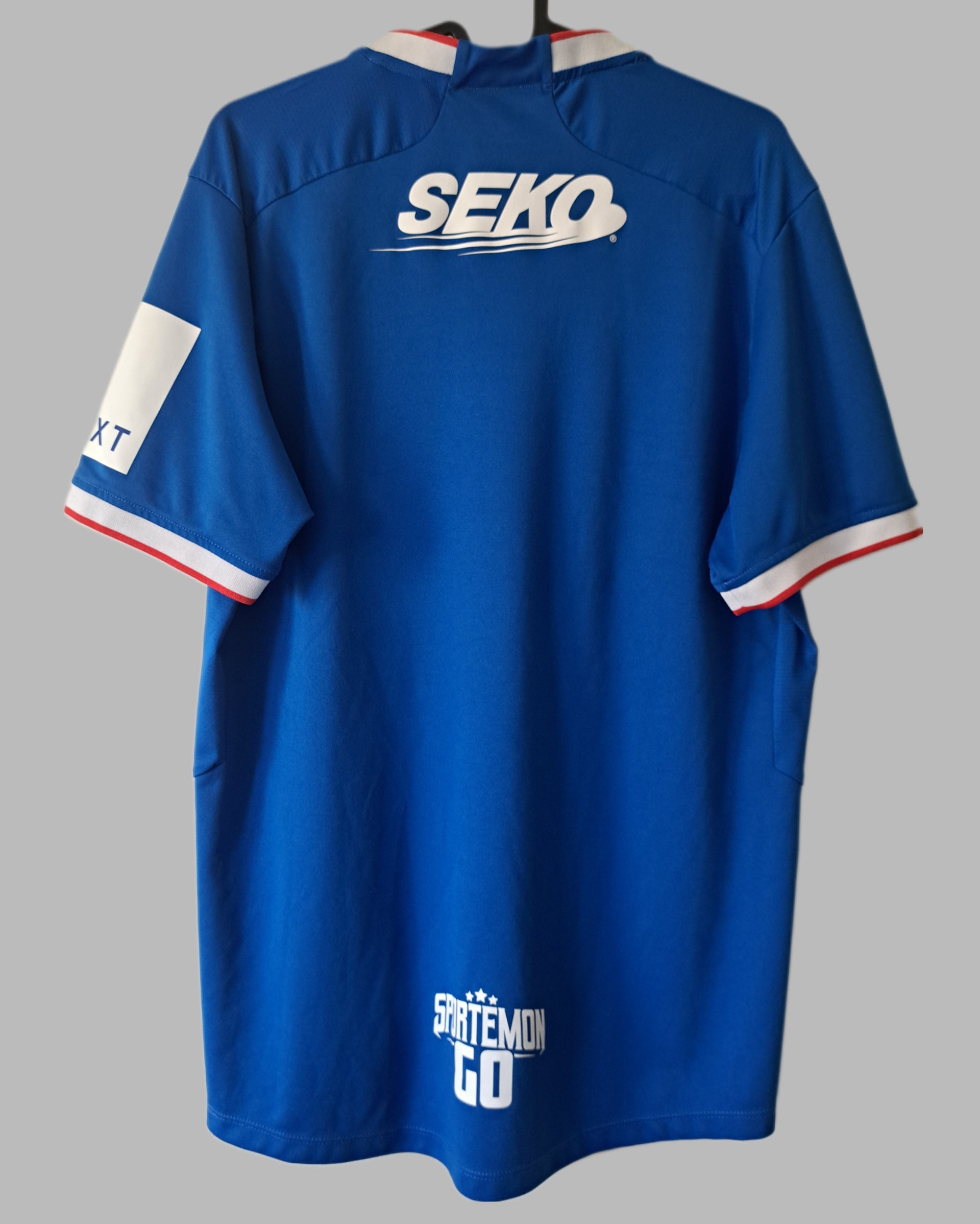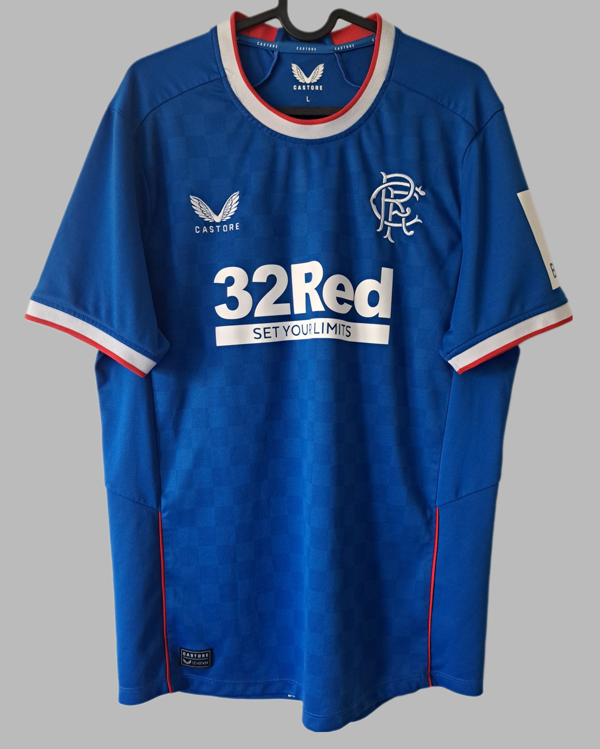 Beautiful shirt made by Castore. The home shirt got a blue base with red and white detailing. The shirt has been worn during the 2022-23 season where Rangers got second place in the league and got last place in their CL group. Worn by the likes of Kent, Tavernier and Morelos.